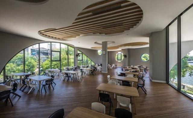 El desarrollo físico también se nutre a través de estos interiores y exteriores. Los parques infantiles, un centro deportivo y una piscina promueven un estilo de vida saludable y la creatividad con clases de arte, sala de música, biblioteca y un master chef de cocina. Los techos presentan formas fluidas divertidas y dinosaurios en las superficies acanaladas.