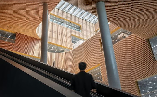 En el nivel principal, un gran atrio central da la bienvenida a los huéspedes a un ambiente vasto pero cálido y acogedor de bambú, roble y terrazo. Arriba, los pisos se apilan y entrelazan, una estrategia arquitectónica para conectar visualmente cada uno de los siete niveles de la biblioteca. El piso inferior sirve como un ágora, o plaza central, que alberga varios eventos, exposiciones, una librería y una cafetería.