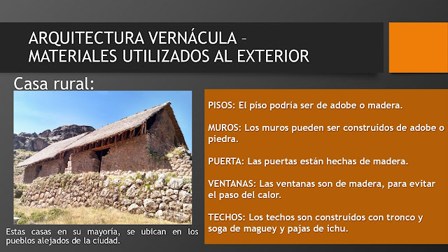 TECHOS: Los techos son construidos sobre troncos rollizos de madera local con uniones amaradas con soga de maguey, y con cobertura de paja o ichu. Estas casas en su mayoria, se ubican en los pueblos alejados de la ciudad.