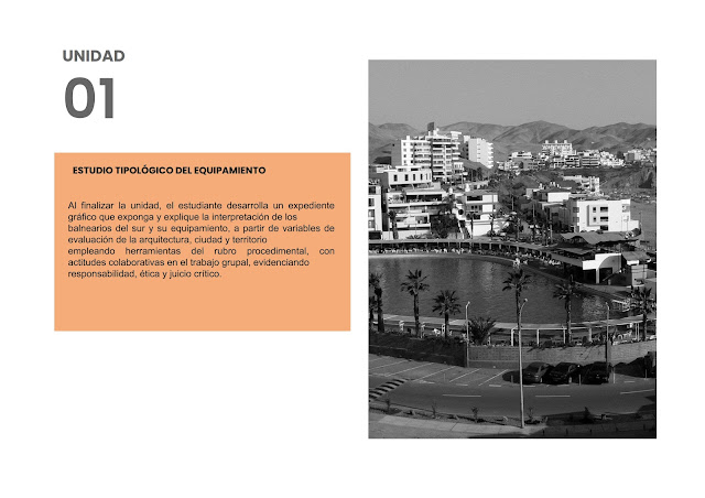 El estudiante desarrolla un expediente gráfico que expone y explica la interpretación de los Balnearios del Sur y su equipamiento, a partir de variables de evaluación de la arquitectura, ciudad y territorio, empleando herramientas del rubro procedimental, con actitudes colaborativas en el trabajo grupal, evidenciando responsabilidad, ética y juicio crítico.