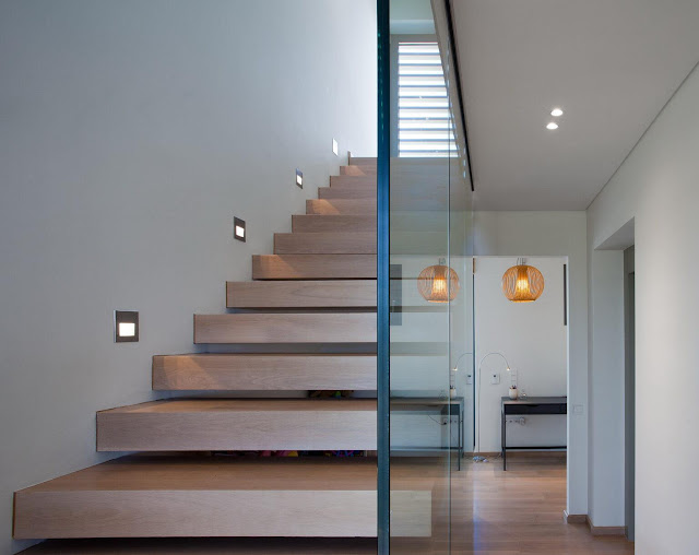 El crecimiento lineal de la escalera en el eje este-oeste va sirviendo por un lado como barrera protectora hacia el norte, y por otro lado a través de las aberturas del techo acristalado como chimenea solar facilitando la ventilación natural de los espacios de la residencia.