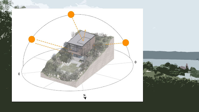 La casa se posiciona en la profundidad de la barranca, utilizando la cavidad que se utiliza para apoyar la casa y disminuir su impacto visual desde la calle, así como también para protegerla. La humedad existente se utiliza como un amortiguador de diferencia de temperatura, la vegetación del bosque actúa como doble fachada protectora del sol y del viento, los participantes visuales de los espacios de la casa a través de reflejos, diferentes niveles de luces y sombras, la La energía solar se utiliza de manera controlada a través de un techo móvil y la casa colindante, surge como elemento complementario de conjunto.