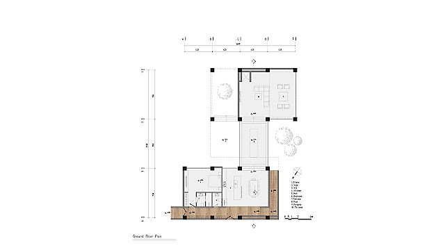 En este sentido, se definió un volumen simple en forma de A en dos pisos en función de la construcción. Luego, de manera similar al patio central, este volumen se redujo y en lugar del patio central, se definió una piscina en el medio del edificio en el primer piso para tener la mayor privacidad mientras se usa la vista.