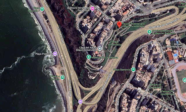 El Parque Bicentenario se encuentra ubicado en la Bajada de Armendáriz, al borde de un acantilado, desde donde se puede apreciar toda la belleza de la bahía de Miraflores.