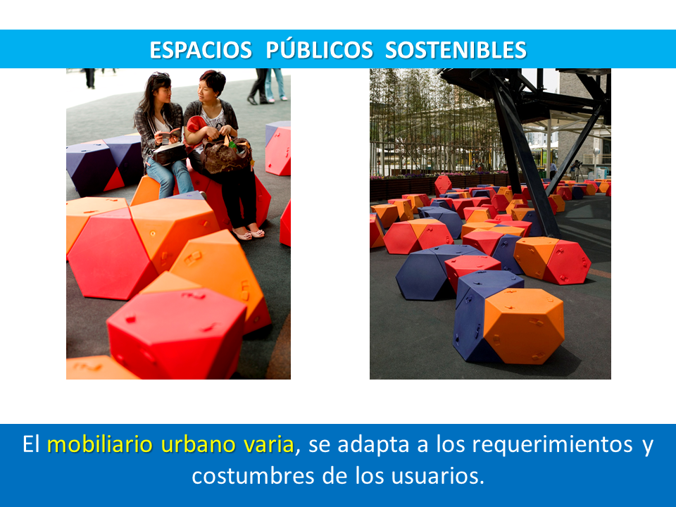 Los espacios públicos diseñados y edificados , son lugares de encuentro e interacción entre los habitantes de la ciudad, en ellos se dan múltiples actividades y por lo tanto deben tener el equipamiento y mobiliario necesario para estas. Cada veza se da mayor importancia e estos espacios, los gobiernos locales se esmeran por dar calidad y originalidad a estos espacios y en muchos casos se convocan a concursos para elegir los mejores diseños.