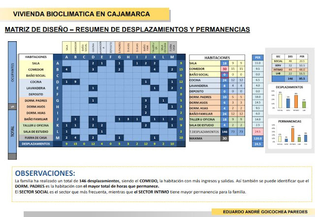 La familia ha realizado un total de 146 desplazamientos, siendo el COMEDOR, la habitación con más ingresos y salidas. Así también se puede identificar que el DORMITORIO DE LOS PADRES es la habitación con el mayor total de horas de permanencia.